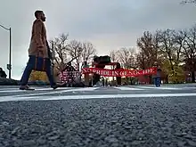 ShutdownDC, in the run-up to the 2020 United States presidential election, began to organize around democracy issues, including large protests outside the home of US Postmaster General Louis DeJoy who faced allegations of slowing postal service and voter suppression.[14] ShutdownDC began to plan actions and meet relating to the possibility of attempts to overturn the 2020 United States presidential election should Joe Biden win and Donald Trump deny the outcome.[15] ShutdownDC planned a week of action starting on election day to "defend democracy" via direct action, including a large event with live performers on election night in Black Lives Matter Plaza and escalating actions should Donald Trump indeed deny the results of the election. The group stated they believed that “Trump will not leave office without mass mobilization and direct action.”[16][17][18][19] ShutdownDC lead efforts to pressure hotels to enforce COVID-19 restrictions on those coming to the city to protest against Joe Biden's victory, and for the revocation of the liquor license for Harry's Bar, which had been fined for COVID-19 restriction violations relating to crowds of maskless supporters of Donald Trump in the venue after election-related protests.[20][21] Amidst this, the group continued to take action relating to inequality and the COVID-19 pandemic, including by dropping body bags in front of the homes of prominent Republican Senators to demand COVID-19 relief legislation.[22] As efforts to overturn the 2020 United States presidential election accelerated, ShutdownDC hosted a vigil outside of the Vienna, Virginia home of Missouri Senator Josh Hawley. Protestors sang songs, told stories, and delivered a copy of the Constitution of the United States to his doorstep. Hawley called ShutdownDC "antifa scumbags" in a Twitter thread about the protest, claiming protests were violent, countering the descriptions of local police who described the protestors as peaceful.[23][24][25] ShutdownDC additionally ran a successful pressure campaign to cancel all Airbnb bookings in DC in the days around the inauguration of Joe Biden, fearing right-wing violence in the wake of the January 6 United States Capitol attack.[26]