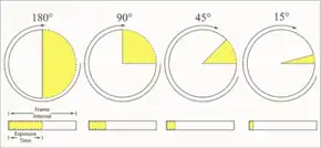 On more advanced cameras, the open portion of the shutter can be adjusted. This shutter setting is referred to as the shutter angle. Adjusting the shutter angle controls the proportion of time that the film is exposed to light during each frame interval. The angle of the shutter forms a proportion to the time that each frame of film is exposed: