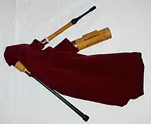 Like other bagpipes, shuttle pipes have a chanter which is used to play the melody.[1] Some modern versions use Great Highland Bagpipe fingering so that Highland bagpipers can easily play it.[3][4] The bag of the modern shuttle pipe is either mouth-inflated through a blowpipe (or blowstick), or bellows-inflated.[1]