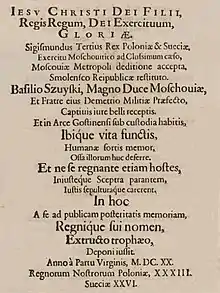 | Jesu Christi Dei Filii, Regis Regum, Dei Exercituum, Gloriæ. Sigismundus Tertius Rex Poloniæ & Sueciæ Exercitu Moschovitico ad Clussinum cæso, Moscoviæ Metropoli deditione accepta, Smolensco Republicæ restitutio. Basilio Szuyski, Magno Duce Moschoviæ, Et Fratre eius Demetrio Militiæ Præfecto, Captiuis iure belli receptis. Et in Arce Gostiniensi sub custodia habitis, Ibique vita functis, Humanæ fortis memor, Ossa illorum huc deferre. Et ne se regnante etiam hostes, Iniusteque Sceptra parantem, Iustis sepulturaque carerent. In hoc A se ad publicam posteritatis memoriam, Regnique sui nomen, Extructo trophæo, Deponi iussit. Anno à Partu Virginis, M. DC. XX. Regnorum Nostrum Poloniæ, XXXIII. Sueciæ XXVI. | To Jesus Christ the Son of God, King of Kings, the Lord of hosts, Glory. Sigismund the Third King of Poland and Sweden, having defeated the Muscovite army at Klushino, accepted the surrender of the capital of Muscovy and restored the Republic of Smolensk. Vasily Shuysky, Grand Duke of Moscow, and his brother Dmitri, army commander, having been taken prisoner according to the law of war, and having been kept under guard in the Castle Gostynihskie, and there lived his life, mindful of human fate, his bones transferred here, lest, while ruling himself, the one unjustly wielding the scepter should deprive the righteous enemies of burial. This monument he ordered to be erected for the public, in the form of a trophy, for posterity and the name of his kingdom. In the year from the birth of the Virgin 1620, of our reign in Poland 33, in Sweden 26. |