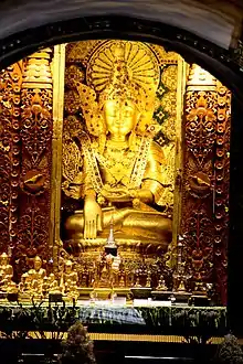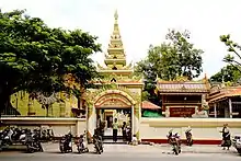 Shwekyimyin Pagoda (Burmese: ရွှေကျီးမြင်စေတီတော်) is a notable pagoda in Mandalay, Burma, located on 24th Street, between 82nd and 83rd Streets. It was built in 1167 by Min Shin Saw, a prince from Pagan, who had come to the shores of the Aungbinle lake to cultivate rice.[1][2] In the early 1900s, in one of its chapels, 40 images of Buddha found in the Mandalay Palace at the time of the British occupation in 1885 are kept for safe custody.[1] A pagoda was built in 1852 over the older one.[3] It is known for the Shweilnbin, an image of Gautama Buddha that was originally placed in the a pagoda built in Pagan by King Narapatisithu and consequently moved to other royal capitals.[3]