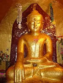 The pagoda houses footprint of Lord Buddha. There are four bronze standing statues of Buddha which are 12 to 13 feet (3.7 to 4.0 m) in height,[7] which are stated to be of the current age Buddha deified on the four sides of the temple; these four are Kakusandha Buddha in the northern face, Koṇāgamana Buddha in the eastern wall, Kassapa Buddha in the southern wall and the Gautama Buddha to the west wall. All of these Buddhas are cast in beaten bronze and seen with their right hand in a posture of abhayamudra, meaning "the fear not gesture" and left hand holding the monk's robe.[11] Below the Buddha Kassapa statue there are a pair of footprints intricately carved on sandstone slab;[7] these were carved from a large "Bodhi-leaf-shaped" slab.[14] They have engravings of a chakra at the centre, which is considered an auspicious symbol. Devotees offer oblations to the footprints through a rectangular wedge created at the rear of the stone slab. The placing of the footprints gives the viewers an impression of Buddha walking towards them.[7]