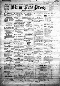 The Siam Free Press was an English-language daily newspaper in Thailand founded in 1891 by Mr. John Joseph Lillie.[1][2][3][4] The Siam Free Press was preceded by The Siam Mercantile Gazette.[5][6][7] Due to a hostile attitude towards the Siamese Government and the Monarchy taken by the Siam Free Press, Mr. J.J. Lillie was expelled from the country by order of King Chulalongkorn by a decree dated 12 March 1898.[8][9][10] The newspaper was then sold by public auction and bought by Mr. Chalant, a Frenchman.[11][12][13] In June 1901, the editor of the Siam Free Press was Mr. Michael O'Leary Dempsey.[14]