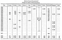 Yasak could be levied on an individual, a tribe, or both.[6] All men between the ages of eighteen and fifty years were subject to this tax.[6] The type of fur and the amount of fur pelts required for this tax varied, depending on how available the pelts were.[6] For example, in the beginning of the 17th century, yasak could be anywhere from five to twenty-two sables per man, but this dropped to three sable pelts by the mid-1600s due to decreases in the sable population.[6] In 1601, Russian tax collectors in the Verkhoturye district collected about ten sables a year from every married man and five sables a year from every bachelor.[1] Officials collecting the yasak tribute also demanded extra furs as "gifts".[9] Fox, squirrel, and ermine pelts were also accepted as yasuk after sable populations began to decline due to overhunting.[1] Instead of one sable pelt, the following was accepted as its equivalent: one fox, glutton (relative of the marten), or otter pelt; two blue-fox pelts; sixteen polar-fox pelts; or one hundred squirrel pelts.[1] The Russian government decided the amount of other pelts that were equivalent to the sable pelt.