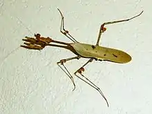 They have unusual leaf-like femoral projections near the joints of their four walking legs. Adults are distinguished from most other mantis species by their leaf-like wings, generally the only green portion of the mantis's otherwise brown and mottled exoskeleton. The thorax of the cryptic mantis is very thin and elongated, similar to that of the wandering violin mantis, Gongylus gongylodes. Adult females generally reach 5–6 cm (2.0–2.4 in) in length, while the males are generally about 1 cm (0.4 in) smaller. The lifespan of the wild cryptic mantis is unknown, but they have been known to live up to nine months in captivity (wild mantises likely live slightly longer, a year and a few months).