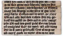 The Sibyllenbuch fragment consists of a partial paper leaf printed in German using Gothic letter. It is owned by the Gutenberg Museum in Mainz, Germany.[2][3] The fragment was discovered in 1892 in an old bookbinding in Mainz.[4] The text on the fragment relates to the Last Judgment and therefore sometimes is also called “Das Weltgericht” (German for "Last Judgment").[2] The text is part of a fourteenth-century poem of 1040 lines known as the "Sibyllenbuch"[5] (Book of the Sibyls[6]) containing "prophecies concerning the fate of the Holy Roman Empire".[7] The British Library identifies the fragment as coming from a quarto volume, which is a book composed of sheets of paper on which four pages were printed on each side, which were then folded twice to form groups of four leaves or eight pages.[1] From analysis of the location of the watermark on the fragment and the known length of the entire poem, it has been estimated that the complete work contained 37 leaves (74 pages) with 28 lines per page.[2]