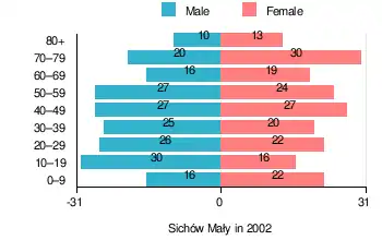 According to the 2002 Poland census, there were 390 people residing in Sichów Mały village, of whom 50.5% were male and 49.5% were female. In the village, the population was spread out, with 19.5% under the age of 18, 31.3% from 18 to 44, 23.3% from 45 to 64, and 25.9% who were 65 years of age or older.[1]