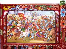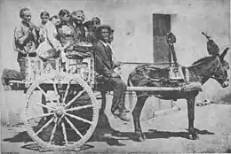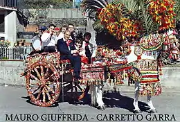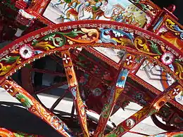 Sicilian wood carver George Petralia states that horses were mostly used in the city and flat plains, while donkeys or mules were more often used in rough terrain for hauling heavy loads.[1] The cart has two wheels and is primarily handmade out of wood with iron metal components. Carts called "Carretti da Lavoro" (carts for work) are used for hauling miscellaneous light loads such as produce, wood, wine, and people, and "Carretti da Gara" are carts for festive occasions such as weddings and parades. The Carretto is like the 'taxi' or 'truck' of today.[2]