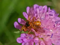 Their larvae are endoparasites of bumble bees of the genus Bombus[5] (B. lapidarius, B. terrestris , B. hortorum, B. pascuorum, etc.). They pupate and overwinter in their victims.[7]