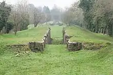 Pits, sherds, and flint are evidence of Neolithic inhabitation of the Siddington area. Beaker pottery found in the area suggests Early Bronze Age activity, and various earthworks are evidence of middle Bronze Age and Iron Age use of the area.[2] Ermin Way, the Roman road connecting Glevum (Gloucester) to Calleva Atrebatum (Silchester) via Corinium (Cirencester) forms part of the parish's north-eastern border.[3] Romano-British settlements existed near the west border and at the south of the parish. The latter settlement is evidenced by pottery and building debris, as well as discoveries of a well and a coin of Constantius II.[3] Excavation of a third Romano-British settlement, near Ermin Way, uncovered a sherd from a situla dating from the Iron Age.[3]