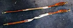 Side reins are made of leather or webbing, sometimes with added elastic, and have several rings or holes for buckles along their length. They are easily adjusted. Some designs have adjustable buckles and attach to the bit with a snap, other designs run through the bit ring, then fold back on themselves and snap to their own rings.