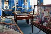 Though the collections change every year, the museum exhibits items in several areas, including but not limited to geology, lace, famous Sidmouthians (including Sir John Ambrose Fleming and Peter Orlando Hutchinson) as well as local history. The museum currently displays a collection of military medals and offers a display recalling Sidmouth during the Second World War. Before the 2021 season, the museum secured several digitisation grants, which provided the opportunity to present many of the museum's offerings in digital form.[4] As a result, visitors can now access a great deal of information via screens and QR codes. Digitisation means that the museum can display much more in an electronic form than would be physically possible in a relatively small building. Almost the entirety of the museum's art collection, for instance, is accessible via interactive screens.[9]