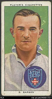 He was a part-time leg break bowler, taking 57 wickets in first-class cricket at a useful average of 32.21.[33] Barnes's leg break spun very little, but he had a topspinner which hurried onto the batsman and yielded him many wickets.[33] Barnes was also a substitute wicket-keeper and a versatile fieldsman. During his career, he was noted for his disaffection for cricket administrators and umpires. On the 1948 tour of England, after an Australian appeal was turned down by umpire Alec Skelding, he grabbed a stray dog and presented it to Skelding, stating: "Now all you want is a white stick".[29] A complex character, Barnes, "rarely forgave a slight or forgot a good turn. Stocky, with blue eyes and powerful wrists, he had a passion for physical fitness, and was an enthusiastic big-game fisherman and golfer".[10]