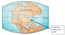 During the Triassic time period, modern day Israel was situated on the northeast corner of the continent which comprised modern day African and Arabian regions as shown in Figure 2. Sand deposits as well as marshy soil accumulated, forming a mainly sedimentary geology. As sea level rose, the Tethys Sea flooded the exposed land giving way to a shallow to deep marine environment. Evidence of this environment is made clear due to the extensive limestone and other carbonate rocks located throughout the region.[6]