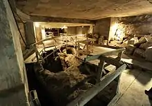 Underneath what is now the Siebenberg Residence remains the discovery of empty burial vaults believed to have been used for Jewish royalty.[3] According to Jewish Law they couldn't bury the dead in the city limits, so they buried people outside the burial limits. During the First Temple the Jewish people lived in the City of David (Hebrew: עיר דוד) which is present day East Jerusalem, Above the empty burial vaults are two holes which is said to have been made to let the spirit of the person exit the chamber. Since there is not much archaeology from the first temple it is hard to date some of the artifacts found at the Siebenberg Museum. A pillar with the engravings of the Menorah was also found. It is most likely from the Second Temple Period, although the base of the Menorah is in the shape of a tripod in contrast to what is depicted on the Titus Arch, which is just a base.