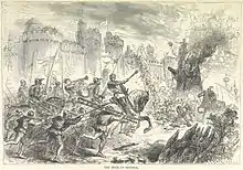 Following the decisive Scots victory at the Battle of Bannockburn in 1314, the Scots had recovered all their strongholds, with the exception of Berwick. In September 1317, King Robert Bruce attempted a siege of Berwick, which lasted until November before he withdrew.[1] The following April, Peter Spalding helped followers of Robert the Bruce enter and seize the town of Berwick from the English. He was English and a burgess of the town, but he was married to a cousin of Sir Robert Keith, Great Marischal of Scotland. The raiding party, led by Sir James Douglas, and possibly the Earl of Dunbar, took the town after a fight. The castle was warned when they lost control of their men, who began to plunder and failed to capture the castle. King Robert soon arrived with an army, and after an eleven-week siege, the castle garrison capitulated due to a lack of supplies.[2] The English burgesses were expelled, and King Robert re-established Berwick as a Scottish trading port, installing his son-in-law Walter Stewart as Keeper.[2]