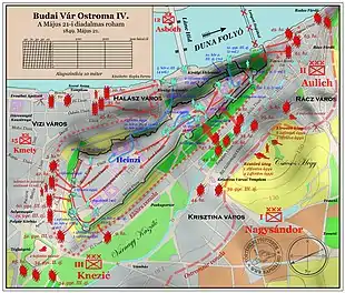 In mid-April, there were some indications that the imperials would retreat from Pest: such as the return of cotton sandbags to the inhabitants, the sandbags having been previously commandeered in order to build defences around the town.[31] On the other hand, Welden wrote a letter to Hentzi in which he ordered him to defend the Danube line, or at least Buda castle, for as long as "the condition of the defensive features of the castle [walls, bastions] and of your food supply makes it possible".[32] The commander-in-chief noted that Hentzi should respond to attacks and gunfire coming from the direction of Pest with bullets and grapeshot only, so as to spare the splendid buildings of the city, giving him permission to use roundshot and shell only if the population of Pest behaved in an unacceptable manner towards the imperials.[32] But Hentzi did not respect this order, and bombarded Pest, destroying the Classical styled buildings on the shores of the Danube, and others in Pest, despite the fact that the inhabitants did nothing to provoke him, and despite a personal request from Görgei in this regard.[33] Welden's letter informs Hentzi that the food supply of the castle was enough for 6 weeks and there was enough ammunition for the defense. It also states that any cannon to be found in Buda and Pest must be brought into the castle, the waterworks which enabled the defenders to be supplied with water from the Danube must be strengthened with firing platforms for cannon, and the palisades on the left bank of the Danube must be removed because they could be advantageous for the enemy.[34]