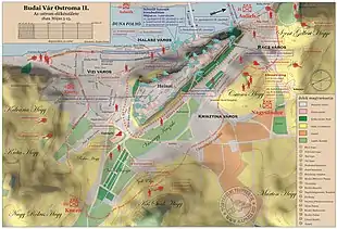 The two battalions from the Waterworks Fortress, together with one of the troops of dragoons, were used as pickets outside Buda, towards Óbuda and the vineyards of the Buda hills.[39]