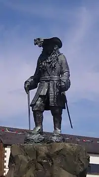 Many of the town's buildings had been hit during the artillery duel. On the morning of 28 August the garrison, accompanied by their families and other camp followers, marched out of Carrickfergus. A cavalry escort under Sir William Russell was provided to accompany them some of the way towards Jacobite-controlled Newry.[10] Soon after they set off, the Catholic troops began to be robbed of their clothes, possessions and weapons by local Protestant civilians as compensation for the plundering and general persecution they had suffered during the Jacobite occupation of the town. The escort was overwhelmed by the weight of numbers, and many of the Catholics ran for shelter amongst the ranks of the Williamite infantry regiments standing outside Carrickfergus. Order was finally restored when Schomberg rode amongst them firing his pistol.[11]