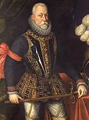 The siege of Geertruidenberg was a siege of the city of Geertruidenberg that took place between 27 March and 24 June 1593 during the Eighty Years' War and the Anglo–Spanish War. Anglo-Dutch troops under the commands of Maurice of Nassau and Francis Vere laid siege to the Spanish garrisoned city.[1] The siege was unique in that the besiegers used a hundred ships, forming a semicircle in a chain on the Mass river to form a blockade. A Spanish force under the command of the Count of Mansfeld attempted to relieve the city in May, but they were defeated and later forced to withdraw. Three Governors of the city were killed - after the last fatality and as a result of the failed relief, the Spanish surrendered the city on 24 June 1593.[4][5] The victory earned Maurice much fame and had thus become a steadfast strategist in the art of war.[6][7]