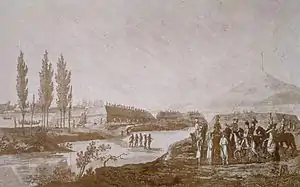 While the siege in Kehl continued, Fürstenberg remained in "observation" at Hüningen, meaning his troops created a surrounding perimeter and initiated construction of earthen works to allow them to assault the fortification later.[23] Probably exceeding his instructions, Fürstenberg offered the commander of the bridgehead, the French general of brigade Jean Charles Abbatucci, the opportunity to surrender, which was declined. Immediately, Fürstenberg's chief engineer opened the fortifications and drained the water-filled moat. In subsequent days, the Austrians expanded ramparts and trenches along the Weyl and to Haltingen. In the night of 30 November – 1 December, Fürstenberg's troops stormed the bridgehead twice, but were twice repulsed.[24] By 20 November, the Austrians had completed construction of the Ferdinand batteries. On the 21–24 of that month, they advanced further, covering the route between Freiburg im Breisgau and Basel, and constructed the batteries of Charles and Elizabeth, which, laying closer to the river, could fire directly into the defenders' redoubts. On the evening of the 24th, the Austrians fired 100 shells and 600 balls into the fortress. On 28 November, Fürstenberg offered General Abbatucci another opportunity to surrender, giving him three hours to consider. Abbatucci responded that any surrender was impossible. In mid-day, a cannonade began that destroyed much of the bridges between the points.[25] This barrage continued for several days, from 28 November until early December. Abbatucci led a sortie in which the French attempted to take one of the batteries from the Austrians. The sortie failed and Abbatucci was wounded in the chest. He died in the evening of 2–3 December.[26]