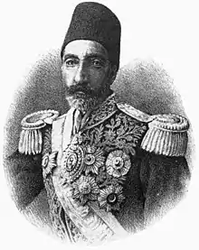 Reza Qoli Khan Hedayat, the author of the Rozat ol-Safay-e Naseri, chronicled the parade.[35] Hedayat highlights that Hesam o-Saltaneh entered the city through the Qanadahr gate. He was accompanied by Sam Khan Ilkhani, Agha Khan Mirpanj, Isa Khan, Abdollah Jamshidi, Majid Khan (Isa Khan's son-in-law), Janu Khan, and other Persian commanders and Herati nobles. The parade then made its way to the citadel, and Hesam o-Saltaneh's entourage entered the gathering hall. A ceremonial procession was held there, and the Herati nobles loyal to the Qajar dynasty paid respects to Hesam o-Saltaneh, who assured them of the Shah's praises. A Persian force led by Sam Khan Ilkhani and Hossein Khan Yuz-Bashi controlled the crowds gathering around the citadel.[36] As part of the ceremony, a well-spoken orator gave sermons in the name of the Sultan of Sultans, Naser al-din Shah. Finally, the nobles of Herat were granted gifts, and the Persians appeased the crowds with pastries and sharbat.