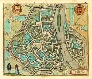 On 10 January Farnese sent a messenger to the Maastricht, the Spanish Captain Francisco Montesdoca, its former governor, to inform the magistrates that he would confirm the city's privileges if they allowed a Spanish garrison inside. The offer was rejected, but Farnese did not besiege the city immediately. He advanced northwards from Limbourg to Visé on 15 January, aiming at crossing the Meuse. He considered doing this at Born, and later at Echt, but he delayed the operation until the army arrived at Beesel. A company of musketeers was sent to the left bank in boats to protect the laying of a pontoon bridge. The first unit to make it to the opposite side, the Tercio of Francisco de Valdés, was sent to occupy Weert. The crossing was completed in three days despite the bad weather.[41][42] Excluding Mondragón's force and several troops left in the area around Diest and Leuven under the Marquis del Monte, the Spanish army numbered 25,000 infantry and 8,000 cavalry soldiers. The whole force arrived to the vicinity of Weert on 23 January, the same day that a meeting of delegates from the provinces of Holland, Zeeland, Utrecht, Gelderland, Friesland and the Ommelanden concluded the Union of Utrecht to push for the toleration towards the Protestant cult.[43] The rebel unity was definitely shattered, as on 6 January the provinces of Artois and Hainaut had formed their own Union of Arras, soon joined by the Walloon Flanders, to ensure the Catholic primacy.[44][45]