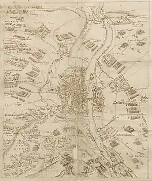 With a population of about 15,000 to 17,500 people,[56] Maastricht was one of the largest cities in the Low Countries, yet its prosperity, based on its textile factories and breweries, had diminished in the ten years prior to the siege because the interruption of the trade due to the disturbances, and the military constraints over the population.[57][58] The garrison began to prepare for a siege already in November 1578, while the Spanish Army was encamped between Maastricht and Dalhem. All those whose loyalty was under suspicion were expelled from the city, vigilance was reinforced, gunpowder was acquired in Germany, cannons were cast in the city's foundries, and the peasants from the vicinity who sheltered in the city were armed with pikes and organized in companies, or put to work in the fortificacions.[59][60] On 10 January, the governor of Maastricht, Melchior von Schwarzenberg, asked Archduke Matthias for money, and on 13 and 14 January, he requested reinforcements, both cavalry and infantry, although they failed to arrive.[61] According to Famiano Strada, the garrison numbered 1,200 soldiers, mostly French, Scottish and English, and about 6,000 armed burghers.[62] Captain Alonso Vázquez put the strength of the defenders at 4,000 'of the most experienced and veteran soldiers among those of the States of Flanders, and well disciplined'.[63]