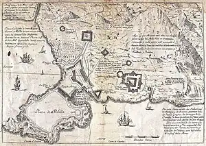 The siege of Melilla was an attempt by the Sultanate of Morocco, supported by Great Britain and Algerian mercenaries,[2] to capture the Spanish fortress of Melilla on the Moroccan Mediterranean coast. Mohammed ben Abdallah, then Sultan of Morocco, invested Melilla in December 1774 with a large army of Royal Moroccan soldiers and Algerian mercenaries. The city was defended by a small garrison under Irish-born Governor Don Juan Sherlocke until the siege was lifted by a relief fleet in March 1775.