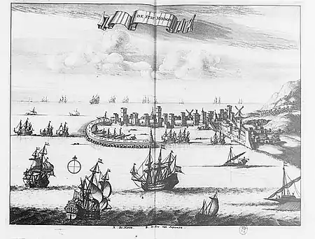 The first target of the Venetian fleet was the island of Lefkada (Santa Maura). Morosini's political rival, Girolamo Cornaro, tried to preempt him and seize the Santa Maura fortress (which he believed to be lightly defended) before the arrival of the fleet from Venice. With a small force he sailed from Corfu to the island, but finding the fortress strongly garrisoned, he turned back. As a result of this misadventure, Cornaro was sidelined for the first year of the war, during which he served as provveditore generale of the Ionian Islands, before he was appointed to command in Dalmatia in late 1685.[16] On 18 July 1684, Morosini left Corfu, and arrived at Santa Maura two days later. After a siege of 16 days, the fortress capitulated on 6 August 1684.[17][18]