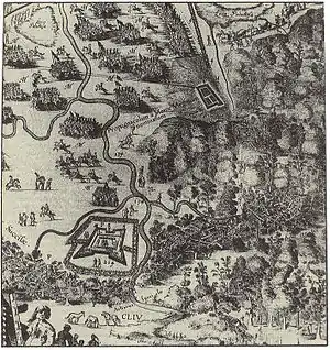 Shein began the siege of Smolensk on 28 October.[10] The Muscovite forces constructed lines of circumvallation around the fortress.[3] Using tunnels and mines, his forces damaged a long section of the city wall and one of its towers.[11] Russian heavy artillery, mostly of Western manufacture,[11] reached Smolensk in December 1632 with even heavier guns arriving the following March.[6] After a preliminary artillery bombardment, Shein ordered an assault, which was repulsed by the Polish defenders.[3] Nonetheless the siege was progressing; Smolensk's fortifications were being eroded, and the defenders were suffering heavy casualties and running out of supplies.[12] By June 1633, some soldiers started to desert, and others talked of surrender.[13]