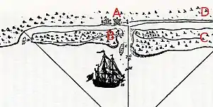 Also on December 24, sails from a pair of ships were spotted approaching St. Augustine. English records do not indicate what these ships were; Spanish records show that they were English in origin, but probably not from Jamaica, since the nature of the siege did not change with their arrival.[34] The expedition to Jamaica, having failed in its mission, returned directly to Charles Town.[35]