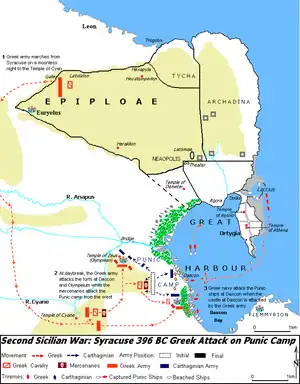 Himilco led the Carthaginian army (50,000 men, 400 triremes, and 600 transports) to Sicily in 397 BC.[14] When the Carthaginians reached Syracuse, their war fleet had shrunk to 208 ships, though 2,000 transports had been employed to carry supplies to the army.[15] The number of soldiers in Syracuse is unknown, as some garrisoned the Carthaginian possessions, and the Carthaginians had been reinforced by Sicels, Sikans and Elymians after arriving in Sicily.