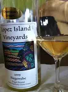 Siegerrebe (literally "Victory vine" in German) is a white wine grape that is grown primarily in Germany with some plantings in England, Vancouver Island,[1] Washington state,[2] British Columbia's North Okanagan and Fraser Valley[3] and Nova Scotia's Annapolis Valley along with a small planting in Tasmania, Australia at Every Man and His Dog Vineyard.[4] Siegerrebe was created by German viticulturalist Dr. Georg Scheu (1879-1949) in 1929 at a grape-breeding institute in Alzey in Rheinhessen, by crossing Madeleine Angevine and Gewürztraminer.[5][6] However, Georg Scheu's son Heinz Scheu has claimed in a book that Siegerrebe was the result of self-pollination of Madeleine Angevine.[6] Siegerrebe received varietal protection and was released for general cultivation in Germany in 1958.[6]