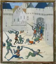 The assault on the ramparts of Vannes occurred on three sides by Artois, Walter Manny and Treziguidy. The besiegers had to retreat in the face of resistance led by Olivier IV de Clisson. At night, Artois, accompanied by William Montagu, Earl of Salisbury, lit two fires in front of two of Vannes gates and attracted the city garrison there. During that time, a small group led by Walter Manny and the Count of Quenfort[note 2] attacked a section of the wall abandoned by the defenders. The troops made a racket to make it appear that Vannes had been invaded. Vannes' garrison was flanked,[5] a part of the city's defenders managed to escape while the rest was massacred.[2] The city then returned to the control of Monfort.
