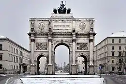 The Siegestor (English: Victory Gate) in Munich is a three-arched memorial arch, crowned with a statue of Bavaria with a lion-quadriga. The monument was originally dedicated to the glory of the Bavarian army. Since its restoration following World War II, it now stands as a reminder to peace.