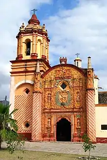 The facade consists of three bodies, a pediment and four estípite columns. The lower body has sculptures of Saints Peter and Paul and who Franciscan coats of arms. The second body has sculptures of Joachem and Saint Anne, with the Virgin Mary in her arms, and a niche in the center. There are also images from the Passion such as nails and a lance. This niche contained an image of Our Lady of Light, but it is empty now. Between the second and third bodies, there is a large window and above it, a representation of the stigmata of Francis of Assisi. The pediment contains a large cross in relief of two styles related to the Franciscan and Dominican orders.[41][42] The bell tower is narrow and the baptistery is at the base of this tower. On the lower part appears a small window which illuminates the baptistery. The cupola of the tower is in a pyramid shape with a Baroque iron cross on top.[41] Indigenous influence is noted in the interior columns of the church, which have images of a jaguar and a person with Olmec features.[42]