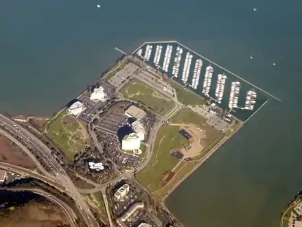 The Brisbane Marina was completed in 1983 along the eastern shore of Sierra Point and has slips for up to 580 boats.[8] The Marina was built by a private developer at the city's expense in exchange for a long-term lease for the entire Sierra Point site; in addition, the developer would subsidize the loan payments for the money the city had borrowed to build the Marina.[6]