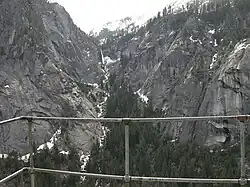 Sierra Point is a point located in Yosemite National Park at the eastern end of the valley, below Grizzly Peak. The trail used to be quite popular, but was closed due to a rock slide in the 1970s. This was John Muir's favorite trail. While a portion of the trail is still missing, it is still possible to reach the point. In fact, the trail is only 0.7 miles (1.1 km) long and about 1,000 feet (300 m) off the valley floor. This hike should not be attempted by beginning hikers due to the difficulty of the missing portions of the trail. In fact, the National Park Service does not recommend that anyone take this trail. Despite this warning, many people still reach the point each year as it is easily accessible from the Vernal Fall trail in Happy Isles, and still has the original railing at the top. It is popular in part because it is the only point in the valley from which four waterfalls can be seen from one vantage point: Vernal Fall, Nevada Fall, Yosemite Falls, and Illilouette Fall.