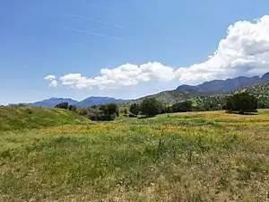 As evidenced by several neolithic sites,[4] which include the Murray Springs Clovis Site and known archeological sites like the Lehner Mammoth-Kill Site, Paleo-Indians,[5] along with animals including mammoths, horses, tapirs, bison, and camels occupied the area more than 11,000 years ago (9000 BCE). Both the Murray Springs Clovis Site and the Lehner Mammoth-Kill Site are now National Historic Landmarks. This area was the home to a large Sobaipuri[6] Pueblo near Fairbank[7] which had several smaller pueblos and settlements[8] throughout the valley,[9][10] a Spanish Fort, Presidio Santa Cruz de Terrenate[8][11] between modern Huachuca City , Whetstone, and Tombstone, on the west bank of the San Pedro River.[6] along with a few Spanish settlers supporting the route to Tucson's Mission San Xavier del Bac and Presidio San Agustín del Tucsón.[12][13][14] Coronado National Memorial was established in the southern Huachuca Mountains to commemorate the expedition of the Spanish conquistador Francisco Vázquez de Coronado utilizing the nearby San Pedro River in his northward search of the Cities of Cíbola, often referred to now as the mythical Seven Cities of Gold.