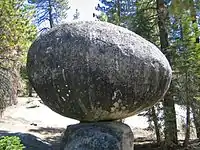 Globe Rock is a large granodiorite, semispherical boulder resting atop a small granodiorite perch. It once served as a gathering place of the Mono Indians as seen by the many acorn grinding mortars in the surrounding granite. Theodore Roosevelt was once photographed here. Globe Rock is a corestone that was formed in place by spheroidal weathering and later exposed by the erosion of the saprolite that once enclosed it.