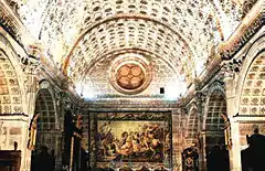 It consists of predella with three bodies of different orders, Ionic, Corinthian and compound,[47] and a superior crowning. In the predella there are four reliefs with scenes of the Passion of Christ. In the first body, in the central street there is a tabernacle of three floors with the images of St. Peter and St. Paul, the Last Supper and on the top floor the Savior. In the side streets with the separation made with Ionic columns, the figures of Saint Andrew and Saint Francis of Assisi are at the ends, on the right side street the Transfiguration of Christ and on the left side the Immaculate Conception. In the second body the order of the columns is Corinthian, in the central street is the Assumption, on the right side a large relief of the Adoration of the Kings, in the side of the Nativity and in the extremes the images of Santa Ana and Santa Librada. In the third body in the central part there is a Calvary: Christ on the cross with Mary and Saint John the Baptist and on its sides the reliefs of the Pentecost and the Ascension of Christ with two exempt figures of saints in each end. The final crowning of the altarpiece was made with a large shield of the bishop commissioner supported by two angels and two representations of the virtues.[48]