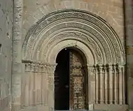 Further east, we find the Puerta del Mercado, formerly "Puerta de La Cadena", which overlooks the Plaza Mayor, Romanesque style, from the 12th century; this door is covered by a closed portico, Neoclassical style, built in 1797 by the architect Bernasconi commissioned by the bishop Juan Díaz de la Guerra. On the portal, a Romanesque rose window of transition, from the 13th century, with a very original tracery design.[11]