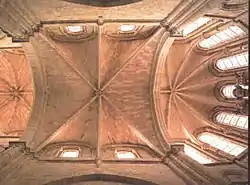 The naves are separated, by enormous pillars, which are each composed of twenty columns attached to capitals of vegetable theme, where the arc-doubleaus and formero arcs are supported. From the capitals, the stony nerves, which form the ogival vaults of rib vault, in general are of simple crossery (with two diagonal nerves), although there are two sexpartite vaults, on the sides of the transept or even octopartite, on the lantern tower. Three of the four pillars that frame the choir are different from the rest of the building, consisting of large cylindrical columns with Romanesque ornamentation in the lower part and Gothic in the upper one.[13]