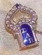 The badge of Sigma Lambda Pi was in the shape of an arch with a crown surmounting it. The Arch had 7 pearls, the Crown 10 pearls and Sapphire at the top. Exposed Gold was nugget finished, and the letters were gold on a background of gold. Colors were Sapphire Blue and Gold. The Open motto was "Dum Vivimus Fratres Vivamus" whose English translation is "while we live, let us live as brothers". The flower was the Carnation.[5]