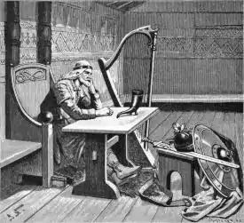 The poem begins with the victorious young Sigurd the Völsung's arrival at the court of Gjúki and it informs that he swore oaths together with the two brothers (Gjúki's sons Gunnarr and Högni).[1] The two brothers gave him many jewels and their sister Guðrún for wife, and they spent time together drinking and talking. Then the two brothers departed to woo Brynhildr and Sigurd joined them.[2] The poet then jumps to the moment when Sigurd shared bed with Brynhildr by putting his sword between them. He never held her in his arms and gave her to Gjúki's son (Gunnar).