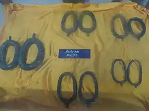 The silambu is a hollow anklet filled with beads that produce noise when the wearer moves or dances.[2] It may be worn on the ankle or the leg. When worn on the leg, it is termed kālchilambu in Tamil.[3]