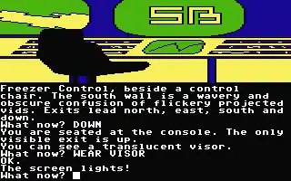 The games use a text parser for entering commands at the "What now?" prompt.[2] The parser can interpret more than a thousand words[3] to control movement or actions. It looks at the command, picking out two or three words it knows, ignoring the order, and tries to guess what is meant.[2] For movement, the usual commands for moving 'NORTH', 'SOUTH', 'EAST' and 'WEST' are available (and their abbreviated forms of 'N', 'S', 'E' and 'W') as well as 'UP' and 'DOWN' ('U' and 'D' respectively) and a number of other directions and 'modes' of movement (like 'JUMP'). For actions, it understands how to pick up objects, opening doors, lighting lamps, as well as dropping objects and wielding them.[2] Additionally, there are commands to invoke 'SAVE' and 'RESTORE' of game positions to cassette tape or floppy disk (for some systems also to RAM), ask for 'HELP', turn off pictures and turn them on again with 'WORDS' and 'PICTURES' respectively, an 'OOPS' command to undo previous commands.[4]