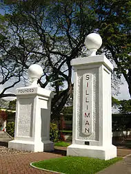 Silliman is located in Dumaguete, a quiet, peaceful seaside community with a population of 116,392.[51][52] The university campus has a total land area of 62 hectares composed of the main campus along Hibbard Avenue, and the campus for the College of Agriculture and the Institute of Environmental and Marine Sciences to the north. Dotted by large acacia trees, the main campus is home to most of the colleges and schools of the university and is adjacent to the city's downtown district. Occupying almost one-third of the downtown area, the campus faces the sea to the east, flanked by its portals which are now considered symbols of the school and city. The three most prominent portals are the Gates of Knowledge, Opportunity and Service. The Gate of Knowledge is the current and main entrance; it is the starting point of the two-kilometer-long Hibbard Avenue which was named after Dr. David Sutherland Hibbard, one of the founders of the institution. The other prominent landmarks on the main campus are the Silliman Hall, which now houses the Anthropology Museum; the Silliman University Church; the Robert B. and Metta J. Silliman Library; and the Claire Isabel McGill Luce Auditorium, the largest theater outside Metro Manila.[53] It is frequented by tourists so the university maintains a campus cruiser, a 15-seater golf cart or tram-like vehicle, to ferry visitors around the campus. It is used to transport students during regular days.[54]