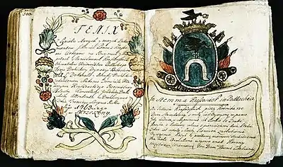 Silva rerum (plural: silvae rerum, Latin for "forest of things"; also Polonized as sylwa, sometimes described as home chronicle) was a multi-generational chronicle kept by many Polish and Lithuanian noble families from the 16th through 18th centuries.[1] Some authors of modern Polish postmodern literature try to create works similar to the silvae rerum of the past.[2] In historical Poland it was written by members of the szlachta (Polish nobility) as a diary or memoir for the entire family, recording family traditions, among other matters; they were not intended for a wider audience or printing (although there were a few exceptions); some were also lent to friends of the family, who were allowed to add their comments to them.[1] It was added to by many generations, and contained various information: diary-type entries on current events, memoirs, letters, political speeches, copies of legal documents, gossips, jokes and anecdotes, financial documents, economic information (price of grain, etc.), philosophical musings, poems, genealogical trees, advice (agricultural, medical, moral) for the descendants and others. The wealth of information in silva is staggering; they contain anything that their authors wished to record for future generations.[1] Some silvae rerum were of truly enormous proportions, with thousands of pages (Gloger cites one of 1764 pages) although most common size is from 500 to 800 pages.[1] They were written from the 16th century (the earliest entries are from the times of the king Stefan Batory) to the mid-18th century (times of the Saxon kings in Poland).[1]